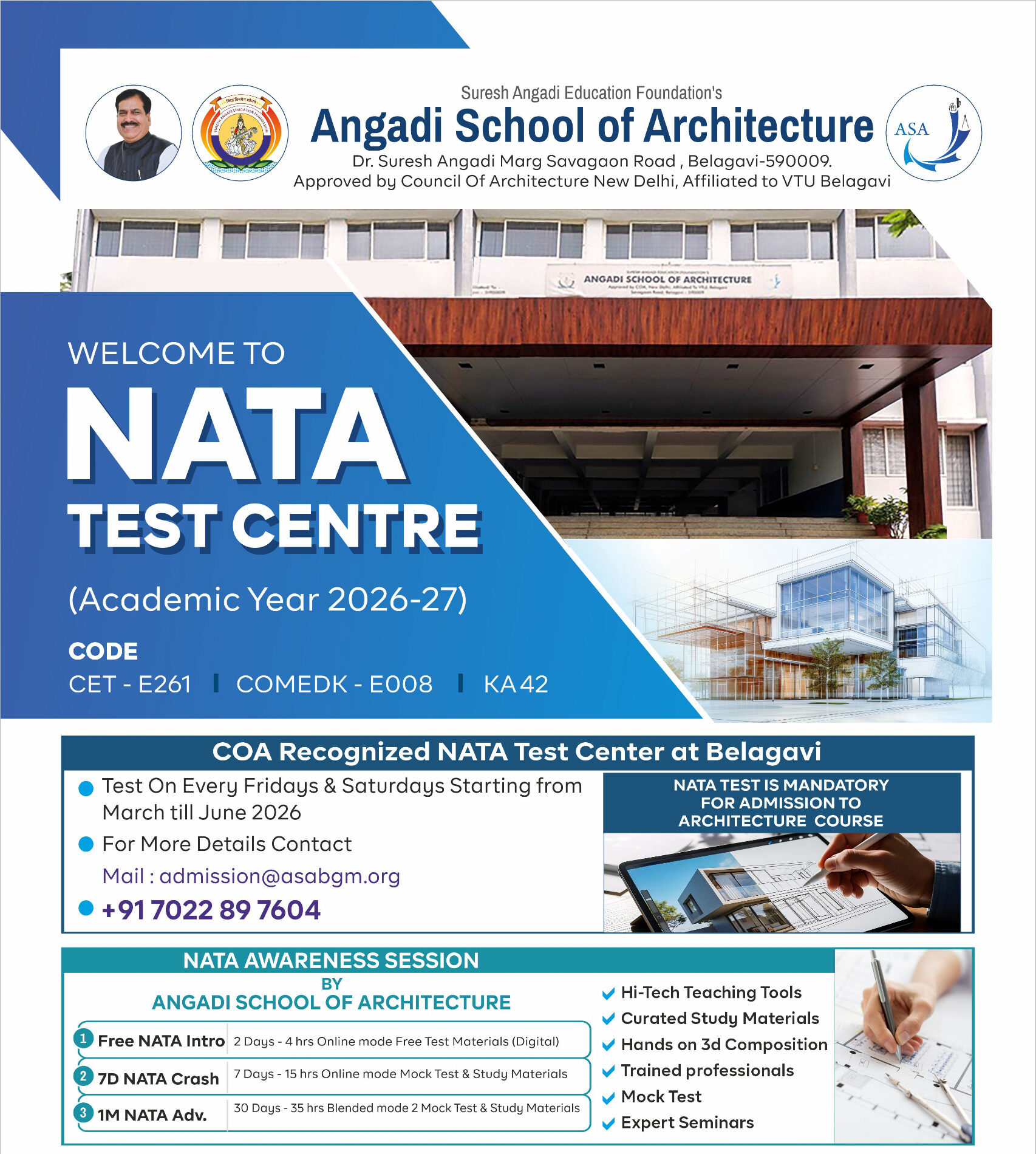 Angadi School of Architecture(ASA), Belagavi, established in 2016 under shelter of Suresh Angadi Education Foundation Trust (SAEF estb – 2008). A well established and experienced trust with more than 10years of experience in running various educational institutes like Angadi Institute of technology and management (AITM), Angadi college of Commerce and Science(ACCS) and Angadi International School (AIS).