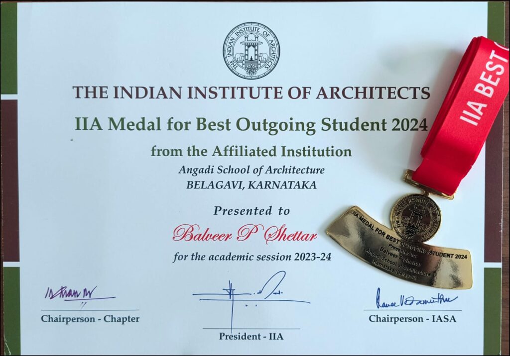Angadi School of Architecture, Belagavi, proudly awarded the IIA Medal for Best Outgoing Student for 2024 to Mr. Balveer P. Shettar.